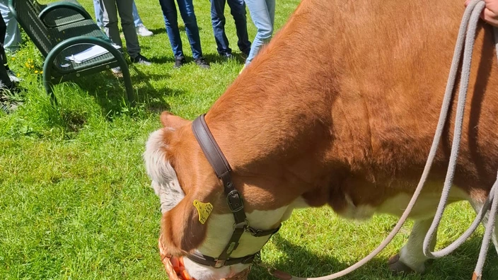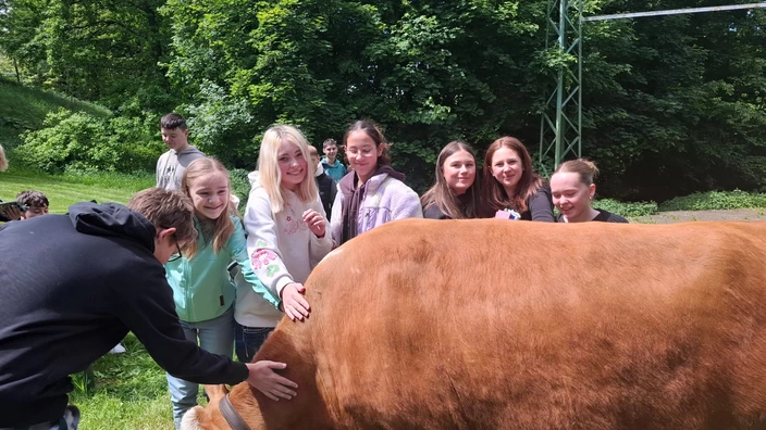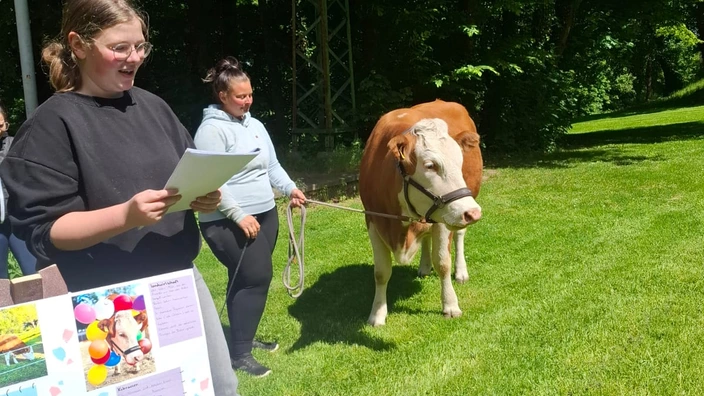 In den vergangenen Jahren wurden auf diese Weise allerhand spannende Themen präsentiert. Von Pferden auf dem Schulhof, über eine Sushi-Verkostung bis hin zu Kameraden von der Freiwilligen Feuerwehr in voller Montur waren schon einige Höhepunkte dabei. Aber was sich da am Freitag, dem 23.05.25 im Schlosspark im Rahmen der Projektpräsentation abspielte, war schon ein echter Hingucker. Emely Teuscher aus der Klasse 7d befasste sich für ihre Projektarbeit mit Kühen und brachte zum besseren Verständnis ihre Kuh Elfriede gleich mit. Die Mitschüler erfuhren auf diese Weise nicht nur alles Wichtige über Kühe im Allgemeinen: Körperbau, Ernährung und artgerechte Haltung, sondern auch spezielle Details, wie, dass Kühe schlauer sind als Pferde und man auf ihnen sogar reiten kann. Reiten durfte allerdings niemand auf Elfriede, denn sie ist gerade trächtig. Doch alle durften Elfriede streicheln und mit leckeren Apfel- und Möhrenstückchen füttern. Auf diese Weise wurde der Unterricht richtig anschaulich. Danke Emely für diese tolle Präsentation!