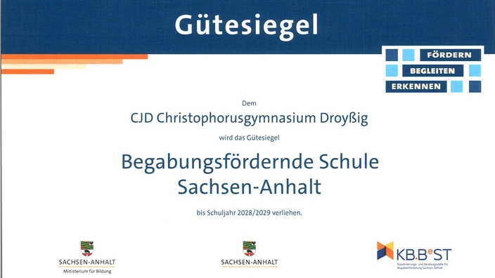 Während des 9. Fachtags Begabungsförderung Sachsen-Anhalt am 18.11.2025 in Halle wurde dem Christophorusgymnasium Droyßig das im Mai erfolgreich verteidigte Gütesiegel für Begabungsförderung überreicht. In dem Siegel spiegelt sich auch das pädagogisch-fachliche Engagement als Kompetenzzentrum des Landes Sachsen-Anhalt im Bund-Länderprojekt LEMAS – Leistung macht Schule – wider. Wir freuen uns als Schulgemeinschaft über diesen besonderen Erfolg.